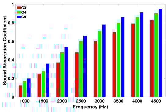 In addition, several studies asserted that the sound absorption value is maximal when the material thickness measures one-tenth of the wavelength of the incident wave [47,48].