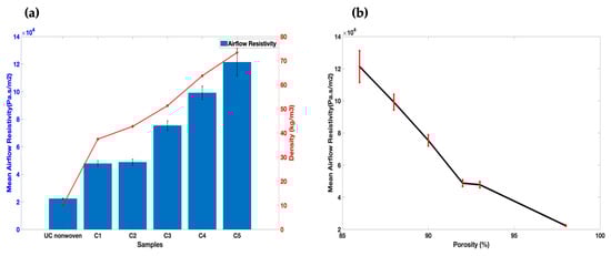 Airflow resistivity depends on density and porosity, as noted by Parikshit et al. [51]. This can be attributed to the nonwoven structure. As porosity decreases and density increases, the airflow resistivity increases. Indeed, a denser and consequently less porous material is going to be more resistant to the airflow. Therefore, the material absorbs more than it transmits. As shown in Figure 6, Figure 7, Figure 8 and Figure 9, airflow resistivity and sound absorption values are directly correlated, as it has just been demonstrated when airflow resistivity raises the sound absorption. Rey et al. found the same result [52].