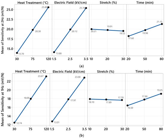To examine the impact of various polarization process factors on PVDF sensitivity across all tested frequencies, a factorial plot was generated using Minitab software to analyze the response variable in the DOE. Figure 17 shows the factorial analysis of the mean sensitivity versus the process variables at three frequencies (2 Hz (Figure 17a), 1 Hz (Figure 17b), 0.5 (Figure 17c)). It was observed that the heat treatment and electric field were significant factors prominently affecting the sensor’s sensitivity, similar to in the β-phase. The polarization time also has a positive impact on the sensor’s sensitivity, but the effect is lower compared to the temperature of the heat treatment and electric field. However, an interesting finding was that the percentage of stretch showed a nearly negative trend across all frequencies. Although statistically negligible, the effect was almost zero.