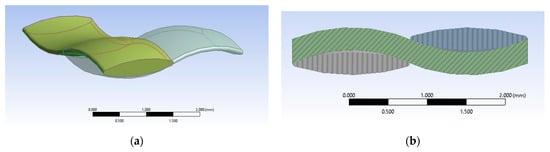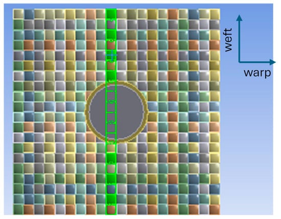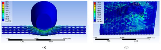 Each layer of yarn was modeled as a continuous, homogeneous structure, and the inter-yarn friction was defined to ensure realistic contact behavior. Solid elements were used for both the yarn and projectile, as they can accurately simulate volume changes, plasticity, and failure. These elements also allow for a better representation of stress–strain relationships in both the yarn and projectile materials. The initial velocity of the projectile was set to 400 m/s, simulating a typical high-velocity impact for a 9 mm FMJ projectile. The fabric panel was fixed at its edges to simulate a rigid support system. This boundary condition allowed for the simulation of a realistic dynamic response to impact.