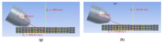 20] studied the oblique impact of two metallic laminates with a hemispherical rigid projectile at different impact angles (0°, 30°, 45°, and 60°). Through numerical simulation, they discovered that the projectile deformation at oblique impact decreases as the impact velocity increases, the projectile deviation angle decreases, the residual projectile velocity correlates with the initial velocity, and the energy absorption of the metallic laminates also correlates with the initial velocity.