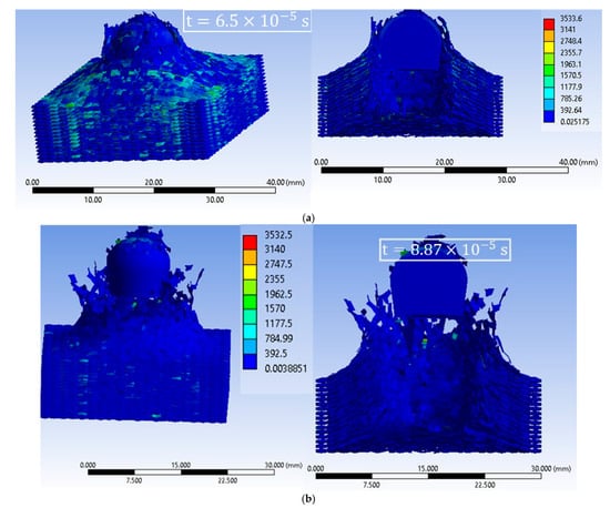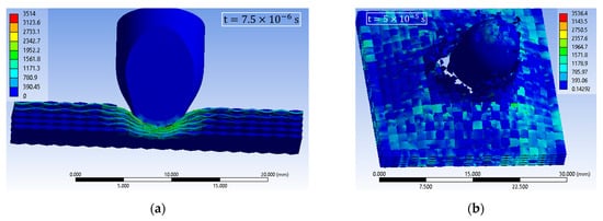 The analysis of the von Mises stress distribution is essential for understanding how materials behave upon ballistic impact in order to evaluate the deformation or failure mechanisms. In the context of simulating the impact of a projectile on an aramid fabric, the stress distribution during impact helps us to determine the zones of failure, indicating the areas where the material reaches or exceeds the yield strength (stress concentrators, red-colored areas), suggesting where the yarns or layers are most likely to break. This allows for the identification of areas of weakness where the fabric begins to fail under impact. Evaluating the stress distribution enables the identification of areas with excessive stress, allowing for improvements in the fabric’s strength through modifications in fiber composition or structural adjustments to enhance ballistic impact protection.