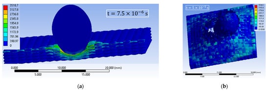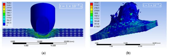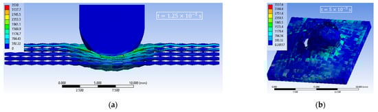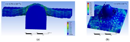 Figure 6). In the second moment of the simulation, the stress waves expand, and the maximum stress increases by 27 MPa compared to the first moment. From the beginning of the simulation, the fabric layers are subjected to the compression exerted by the projectile. At time moment