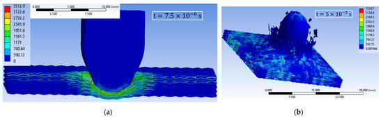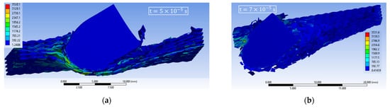 At the first moment of impact, no wire is touched in the case of the numerical simulation, with the projectile trajectory at 70°. The next moment records a very small stressed area. As the projectile advances through the fabric, the stressed area increases. At the time moment, stress waves are present on the wires in the warp direction, wires that contact the side of the projectile’s jacket (