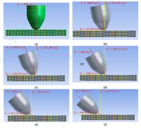 Simulating impacts at oblique angles on a multi-layered panel (16 layers) can lead to a very large number of elements and interactions between layers, which makes the computational process inefficient. Reducing the number of layers allows us to explore several impact angles (10°, 20°, …, 70°) in a shorter time without significantly compromising the accuracy of the obtained results.