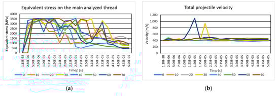 At the first moment of impact, in the simulation with the projectile trajectory oriented at 10°, the wires in the impact zone are observed to be stressed (Figure 6). In the second moment of the simulation, the stress waves expand, and the maximum stress increases by 27 MPa compared to the first moment. From the beginning of the simulation, the fabric layers are subjected to the compression exerted by the projectile. At time moment the main wire is stressed to the edge. At the next moment, the wires that are in contact with the projectile on the first layer break due to compression. As the projectile advances, stress waves also become visible on the secondary wires. At time moment s, the cone begins to form on the back face of the target. At time moment , all layers are broken. At the end of the impact, fragments of broken wires are visible on the nose of the projectile. The laminated panels are damaged in and around the impact zone, and the wires are pushed laterally, showing bending in the transverse direction. At the first moment of the simulation, the analyzed main wire shows a slight compression in the impact zone. At time moment s, the wire is both compressed and stretched, showing small fragments breaking away from the impact zone. Complete breakage of this thread becomes visible at time moment s. This breakage is not symmetric, with fragments of the wire being broken in the impact zone, as well as fragmentation of a part of the wire after it has been broken in the central zone.
