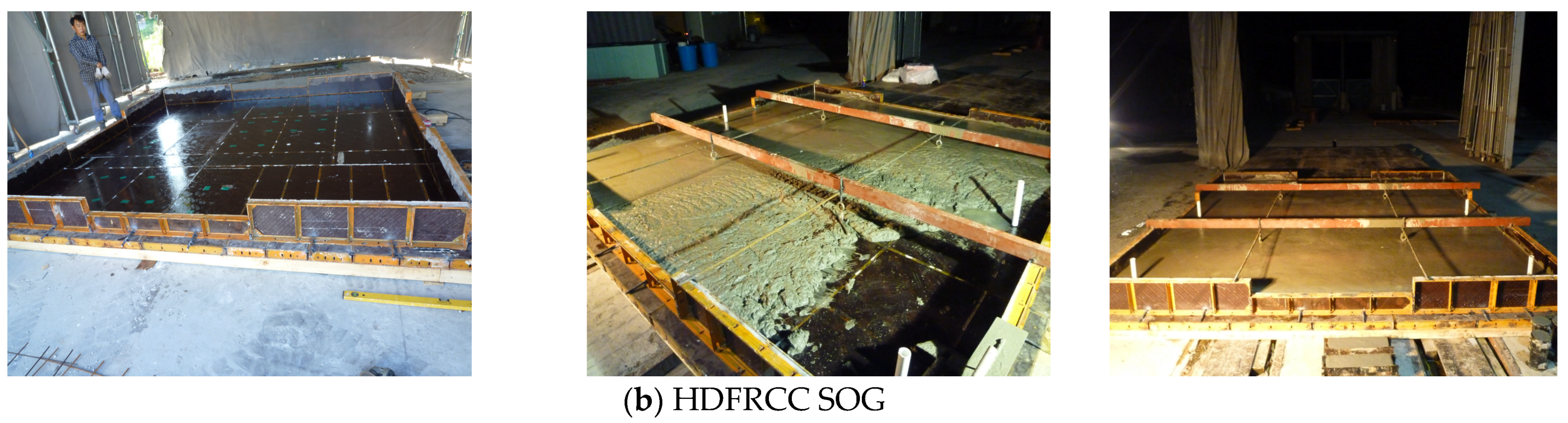 - The use of mesh-free HDFRCC resulted in superior crack resistance, potentially enabling the construction of larger floor slabs without contraction joints and significantly improving load-bearing performance. Economically, eliminating welded wire mesh—which requires considerable time and additional labor to set in place—can accelerate construction schedules and reduce labor costs. Furthermore, the potential to design thinner HDFRCC SOG sections while meeting equivalent load-bearing demands could decrease material consumption and enhance overall project cost efficiency.