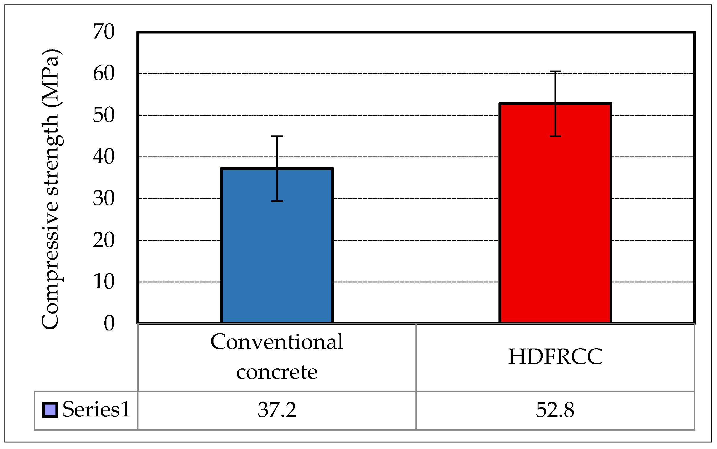 - The compressive strength of the conventional concrete was determined to be 37 MPa, while the HDFRCC exhibited a notably higher compressive strength of 54 MPa. Additionally, HDFRCC demonstrated an average flexural tensile strength of 3.9 MPa at initial cracking, 9.7 MPa at maximum load, and an equivalent flexural strength of 6.9 MPa. These results indicate the superior strain-hardening behavior of HDFRCC compared to conventional concrete.