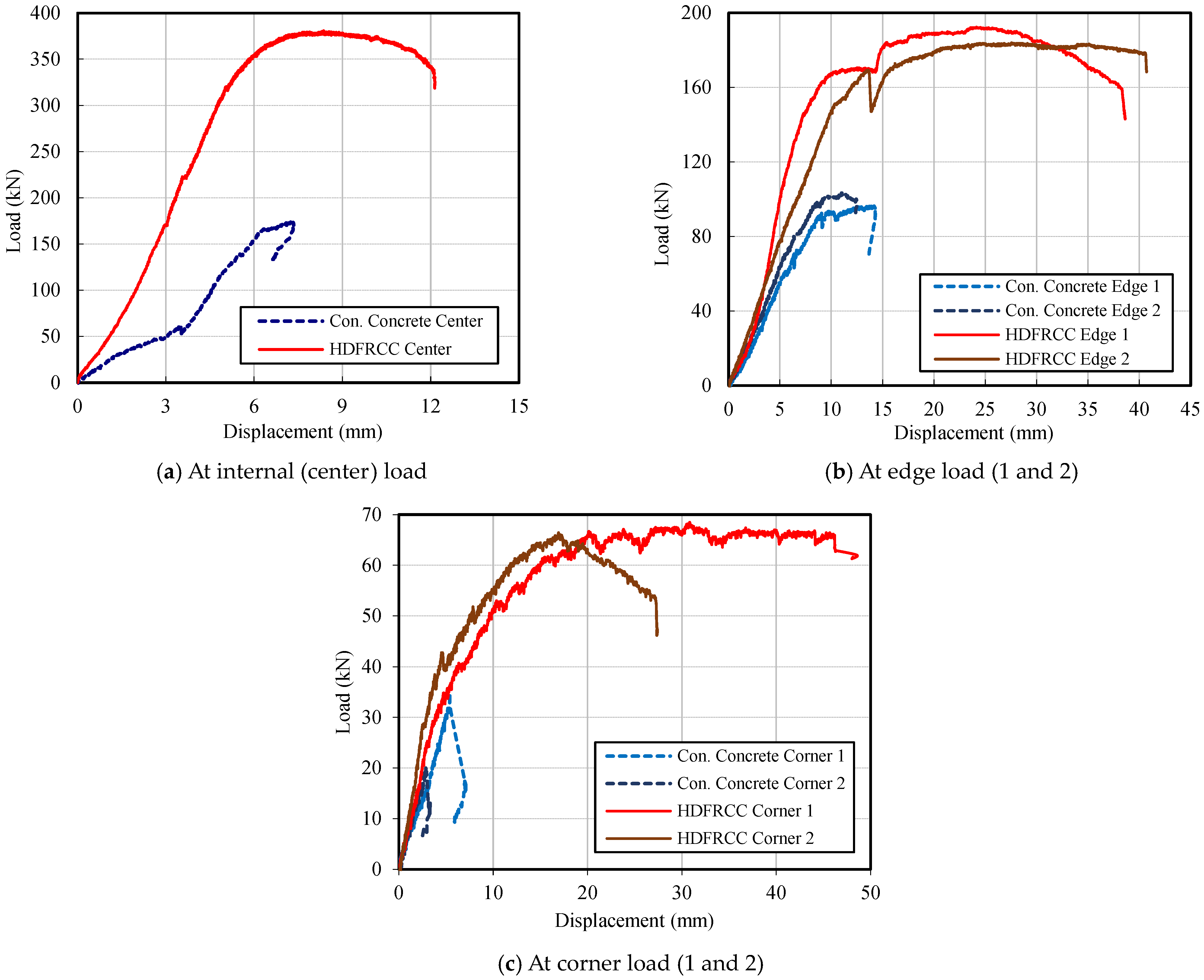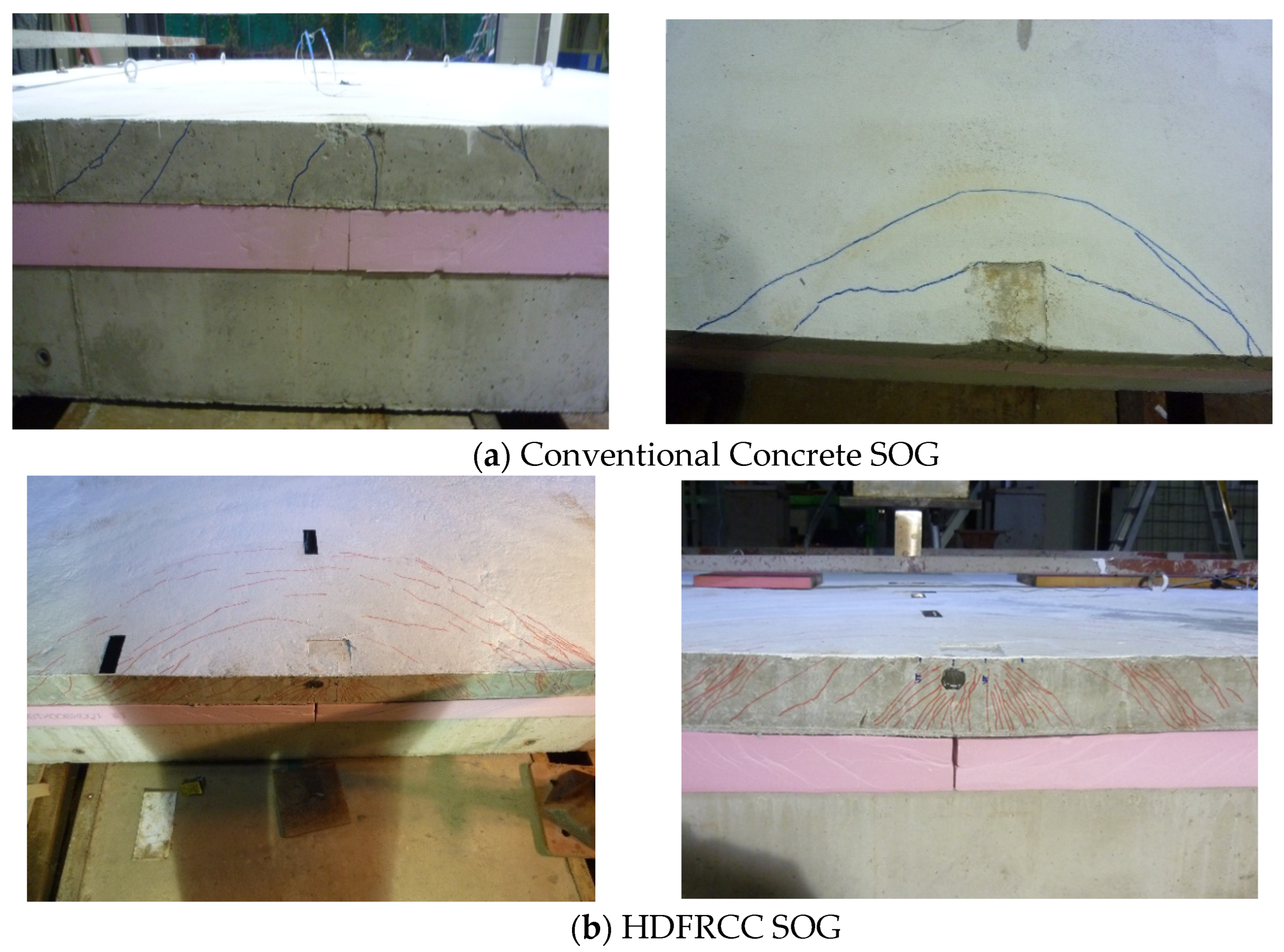 - The experimental results demonstrated that the HDFRCC SOG exhibited approximately twice the load capacity of the conventional concrete SOG across all loading scenarios: center (380.82 kN), edge (183.94 kN and 192.37 kN), and corner (66.41 kN and 68.47 kN). While the conventional concrete SOG primarily experienced flexural failure, the HDFRCC SOG showed a more ductile response, characterized by a combination of flexural and punching shear failure. The distributed microcrack formation and fiber bridging effect inherent to HDFRCC contributed to its higher load capacity, improved crack control, and enhanced energy absorption capabilities.