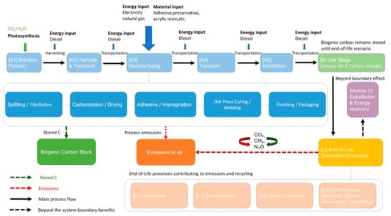 Bamboo scrimber is widely recognized as a representative product among bamboo-based fiber composite materials due to its high density, structural stability, and extensive application in outdoor engineering [21,22,23,24,25,26]. Therefore, assessing its life cycle carbon footprint can provide insights applicable to a broader category of bamboo fiber composites.