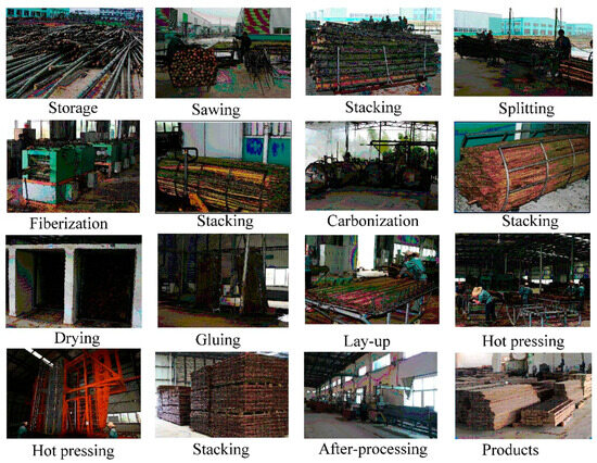 The field investigation mapped out the different production stages of BS. On-site visit was undertaken to Yingtan Yike Bamboo Industry Co., Ltd. The manufacturing process and relevant machines or facilities for producing BS are shown in Figure 4.