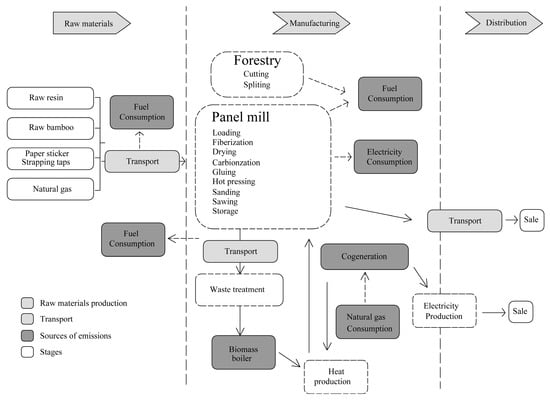 About Background Data for Raw Materials, Energy Consumption, and Direct Emissions. First, a cut-off rule was established: materials that constitute less than 1% of the total raw material mass can be omitted [8]. According to the <1% cut-off rule, auxiliary materials such as hydrogen peroxide and packaging fillers, which accounted for less than 0.5% of the total mass input, were excluded from the LCI model. The emission factors (EF) for each material and energy source were derived from multiple sources to ensure representativeness and reliability. For bamboo bundles and adhesives, data were taken from the “Life Cycle Carbon Footprint and Energy Consumption Assessment of the Biomass Material Industry in China” [29], which is based on Chinese industrial processes. For phenolic resin and UV paint, the Ecoinvent 3.8 database and CLCD-China-ECER 0.8 were used, with preference given to China-specific datasets where available. Electricity and steam emission factors were obtained from CLCD-China-ECER 0.8 (based on 2021 national energy mix data), while diesel and water data were sourced from ELCD 3.0 [7]. The year of data collection for all background datasets ranges from 2019 to 2023, ensuring compatibility with the field survey period (2023–2024). To improve transparency and reproducibility, all emission factors, including those for electricity, steam, diesel, adhesives, coatings, and packaging, are summarized in Table 4, together with their units, database versions, and regional applicability.