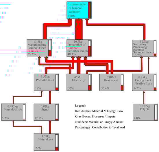 Environmental load distribution network for the production of 1 m2 of bamboo scrimber under the cradle-to-gate system boundary. This is a SimaPro process-network output. “Heat wood” denotes the background heat supply process (fuel side). The node value/percentage indicates the contribution to total GWP (including upstream), not the energy inventory, and percentages are not additive. Quantitative energy use is reported in Table 1 (delivered steam 128.5 MJ; ≈184 MJ at the fuel side, assuming ~70% boiler efficiency), and the stage/sub-process partitioning follows Table 3 (harmonized figure).