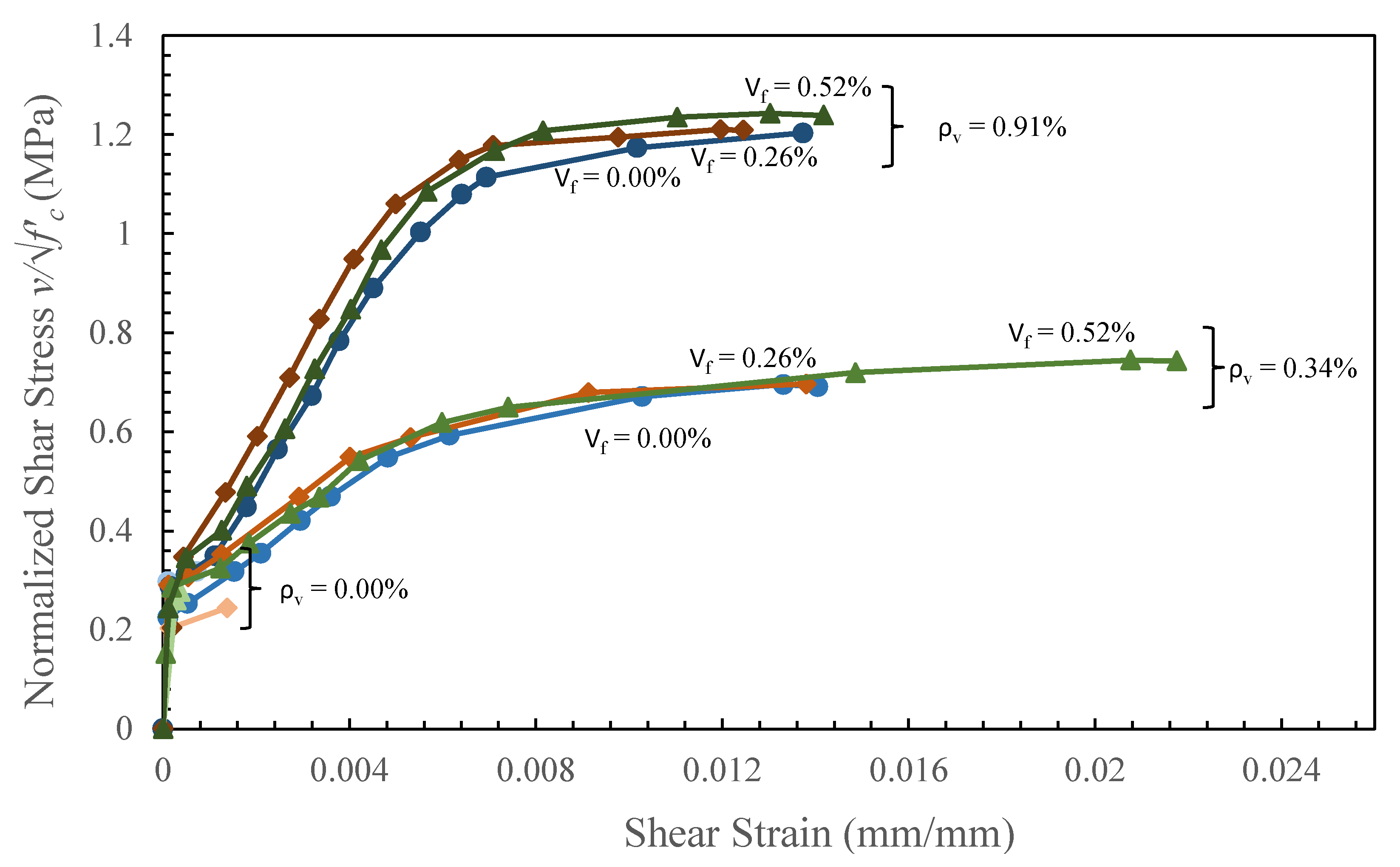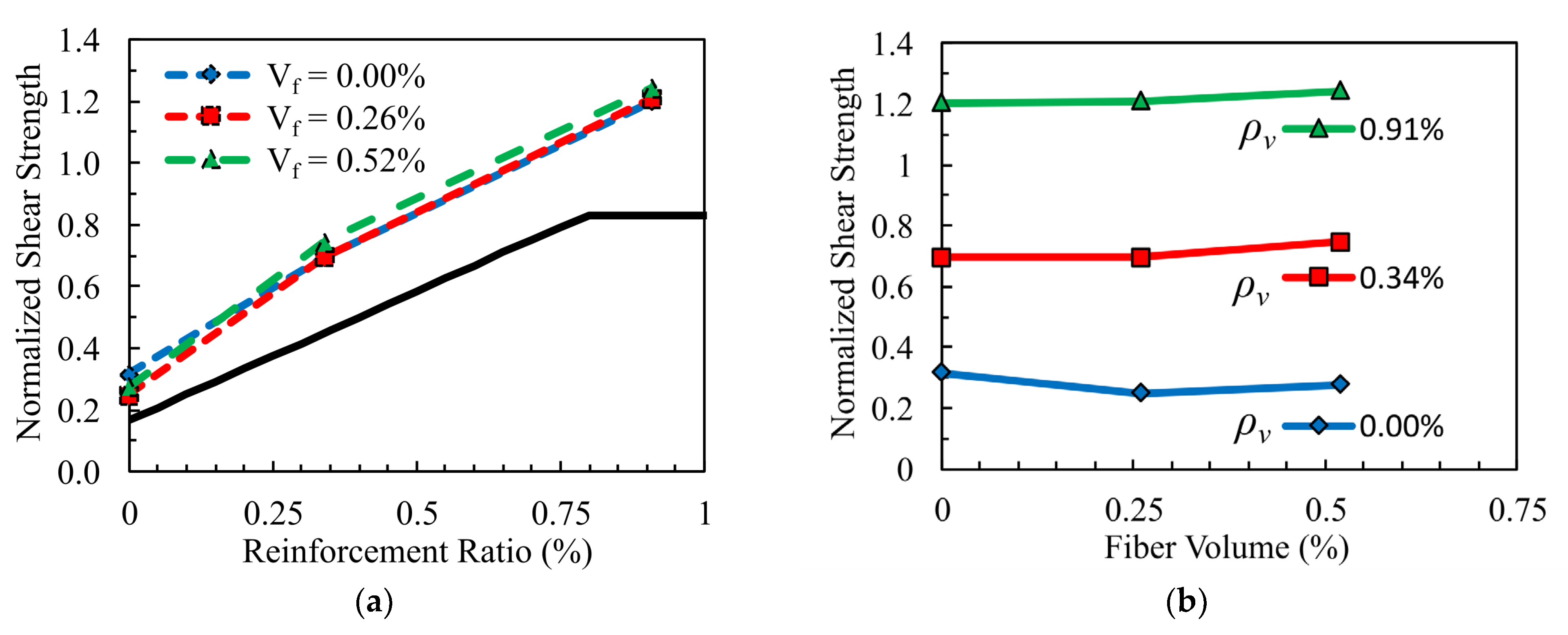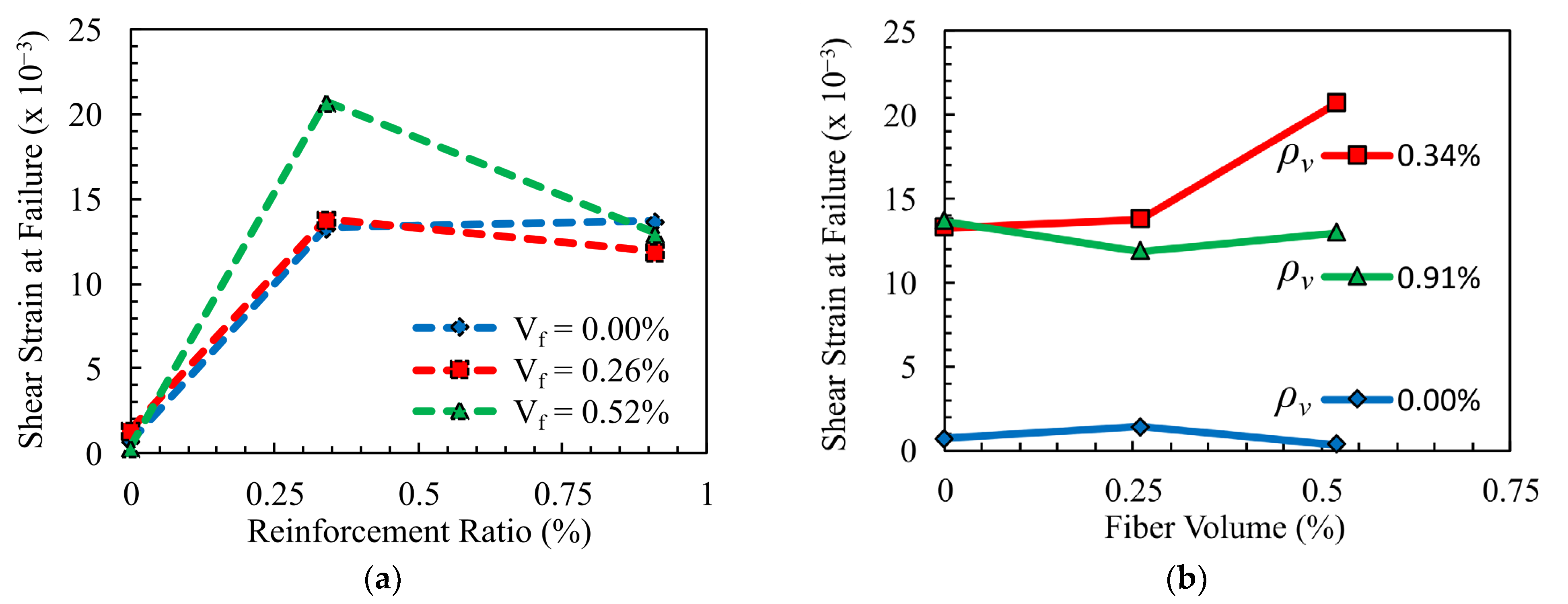 - The results suggest that the most promising benefits of macro-synthetic fibers occur in concrete panels with fiber volumes ≥ 0.5% and low transverse reinforcement ratios (ρv ≤ 0.5%). Future research should explore a broader range of fiber types (e.g., varying in shape, material, and coating) and concrete mixtures to evaluate the generalizability of these findings and further advance the structural application of PFRC (polymer fiber-reinforced concrete).