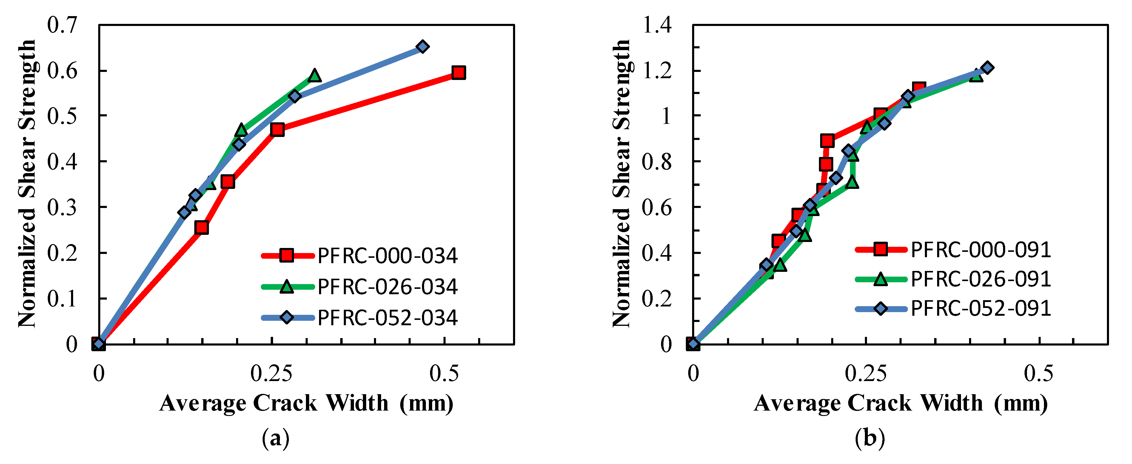 - The addition of macro-synthetic fibers proved effective in reducing both maximum and average shear-induced crack widths in panels with a low transverse reinforcement ratio (ρv = 0.34%). At a shear stress corresponding to approximately 50% of specimen capacity, increasing the fiber volume fraction from 0% to 0.52% reduced the maximum crack width by 50% (from 0.6 mm to 0.3 mm) and the average crack width by 22% (from 0.32 mm to 0.25 mm). This benefit diminished in specimens with higher reinforcement, indicating that the effectiveness of fibers is influenced by the amount of transverse reinforcement present.