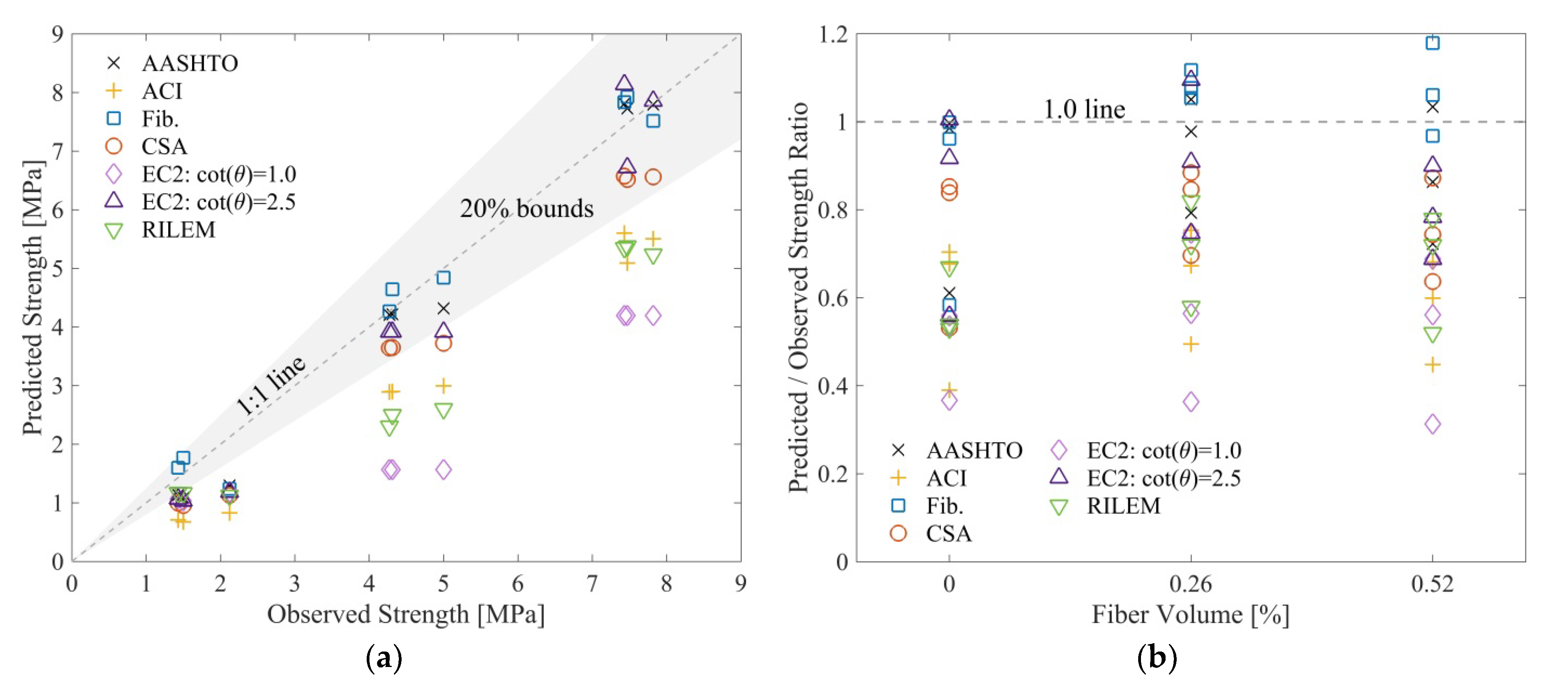 - With respect to determining shear strength, the fib MC2010 [36] demonstrated the best overall performance, while ACI 318 [24] and EC2 [40] with cot(θ) = 1.0 tended to significantly underestimate PFRC panel strength. These preliminary findings suggest that for design applications involving PFRC, fib MC2010 offer the most reliable predictions among the codes assessed. Additional work is recommended before definitive conclusions are drawn in this regard.