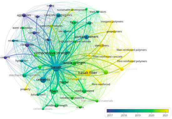 Figure 2, derived from a VOSviewer version 1.6.20 analysis of the Scopus database based on keyword frequency, reveals that prior studies have not extensively explored the use of basalt as a fiber in alkaline settings, an aspect this research aims to address. This study also seeks to measure the tensile resilience of each specimen, viewing it as the primary metric in the optimization process. During this optimization, several preparatory variables, such as the kind of alkali, its concentration, and the curing duration, will be examined. Hence, this research aims to bridge the knowledge gap regarding the impact of various alkalis on cement paste preparations enriched with eco-friendly fiber additives. Moreover, Figure 2 indicates a surge in research focusing on basalt fibers from 2005.