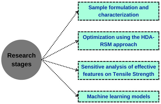 The research route for this investigation is illustrated in Figure 3. Based on the outlined framework, this study is segmented into four phases: (1) sample formulation and characterization, (2) optimization using the HDA-RSM approach based on second-order polynomial regression, (3) development of a prediction system, and (4) Machine Learning (ML) model development based on the historical databank. The experimental and computational evaluations proceed in a stepwise manner, encompassing data assembly, classification, and model formulation.