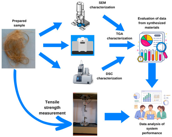 Figure 5 depicts the subsequent steps undertaken after the samples were realized. Initially, the samples undergo three distinct characterization processes: TGA, SEM, and DSC. Following these characterizations, the tensile strength and modulus of elasticity of each sample are assessed using the Universal Testing Machine, TIRA TEST 2300 apparatus. The concluding step involves analyzing the accumulated data to determine the efficacy of the process in enhancing the quality of the samples. All experimental procedures in this research were conducted based on ČSN EN ISO 2062 [47], ČSN EN ISO 5079 [48], ČSN EN ISO 11358-1 [49], ČSN EN ISO 11357-1 [50], and ISO/TS 21383:2021 [51].