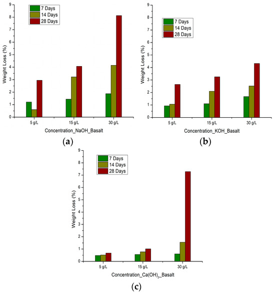 The alkalinity of the testing environment for basalt fibers was controlled by dissolving varying concentrations of NaOH, KOH, and Ca(OH)2 in distilled water, resulting in highly alkaline solutions with pH values ranging from 13.38 to 14. Figure 7 presents the weight loss (%) of basalt fibers following exposure to these alkalis over different durations. In Figure 7a, NaOH treatment shows a consistent increase in weight loss with both concentration and time, peaking at 8% after 28 days with a 30 g/L solution, indicating aggressive degradation. In contrast, Figure 7b shows KOH-induced degradation to be less severe, with a maximum of 4% weight loss under the same conditions, suggesting a comparatively milder reactivity. Figure 7c illustrates Ca(OH)2 exposure, where initial degradation was minimal, but a notable increase to 7% weight loss occurred only at 28 days with 30 g/L concentration, implying a delayed or threshold-dependent reaction.