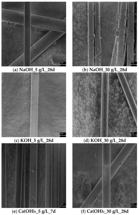 The role of alkali type is also significant. NaOH, due to its smaller hydrated ionic radius, penetrates more effectively into the fiber network, causing more aggressive dissolution relative to KOH [52]. By contrast, Ca(OH)2 behaves differently: although it maintains a highly alkaline pH, the presence of Ca2+ ions can lead to precipitation of secondary calcium-silicate-hydrate (C-S-H) phases on the fiber surface. This deposition may create a passivation layer that temporarily slows further attack, explaining the delayed but eventually pronounced degradation observed at longer durations with higher Ca(OH)2 concentrations. The lower OH− activity of Ca(OH)2 is consistent with the measured pH values of the prepared solutions (Table 4), highlighting that solution alkalinity directly influences the rate of silicate network dissolution and fiber degradation.