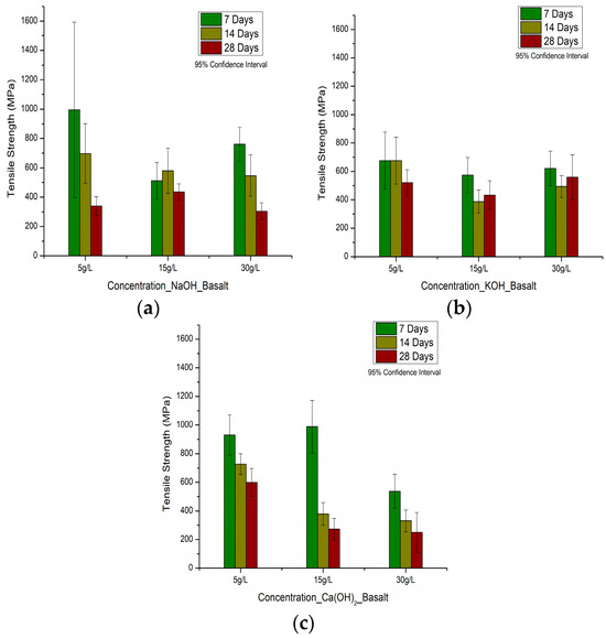 The tensile strength of basalt fibers subjected to various alkalis, concentrations, and durations in this study: (a) NaOH, (b) KOH, and (c) Ca(OH)2 (a–c).