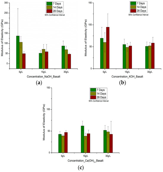 The modulus of elasticity of basalt fibers subjected to various alkalis, concentrations, and durations in this study (a–c).