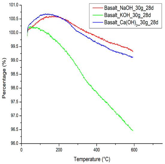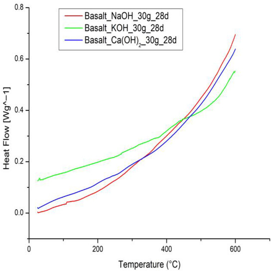 Figure 11 presents Differential Scanning Calorimetry (DSC) data for basalt fibers treated with 30 g/L NaOH, KOH, and Ca(OH)2 after 28 days, highlighting the thermal properties and phase transitions of these fibers. All treatments show endothermic reactions, with heat flow increasing as temperature rises. Basalt fibers treated with NaOH exhibit the lowest initial heat flow, but after 200 °C, heat flow increases sharply, surpassing the other treatments above 400 °C. This suggests more intense decomposition or structural changes at higher temperatures [65,66]. KOH-treated fibers show the highest initial heat flow, but the increase is more gradual, stabilizing after 400 °C, indicating fewer thermal changes and suggesting greater thermal stability. The NaOH and Ca(OH)2 treatments display similar thermal behavior, marked by substantial endothermic activity above 400 °C, pointing to significant structural alterations at high temperatures. In contrast, KOH-treated fibers show a more stable thermal response, indicating enhanced structural integrity during heating. These results indicate that NaOH and Ca(OH)2 are more aggressive in modifying the basalt fiber structure, while KOH treatment provides greater thermal stability [67]. This analysis is crucial for assessing the thermal stability and performance of alkaline-treated basalt fibers in various applications.