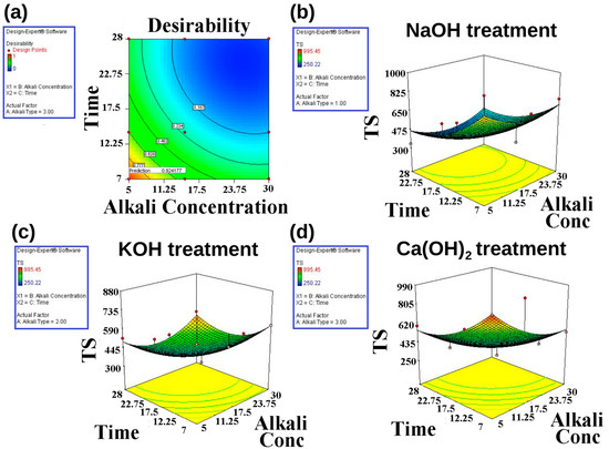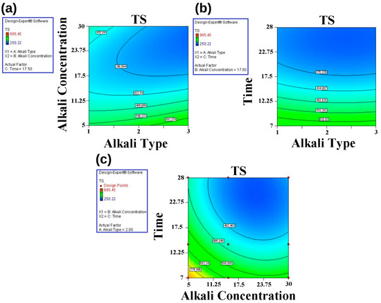 The sensitive analysis of the quadratic model is based on (a) Alkali Concentration-Alkali type vs. TS, (b) Time-Alkali type vs. TS, and (c) Alkali Concentration-Time vs. TS.