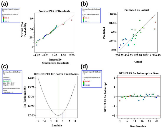 Figure 14d assesses the influence of individual experimental runs on the regression model’s intercept. The DFBETAS values remain within the recommended threshold (±1), implying that no single experimental run excessively influences the model. This confirms the robustness of the regression model, suggesting that the tensile strength predictions remain stable across different experimental conditions. Overall, these diagnostic plots confirm that the RSM model effectively describes the relationship between tensile strength and experimental factors. The model assumptions are satisfied, and no significant transformations or adjustments are needed, ensuring reliable predictions within the studied parameter space.