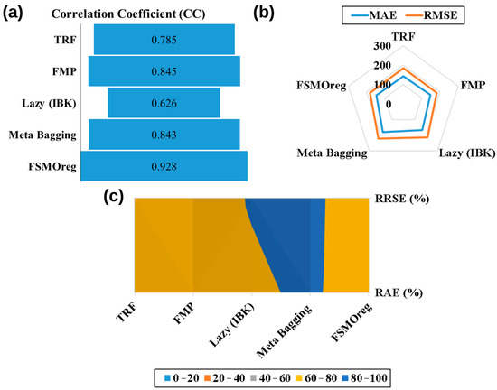 Figure 16a shows the Correlation Coefficient (CC) values, indicating the strength of the relationship between predicted and actual TS values. FSMOreg demonstrates the highest CC of 0.928, showcasing the strongest predictive ability. FMP (0.845) and Meta Bagging (0.843) perform well but slightly lower than FSMOreg, while TRF (0.785) exhibits moderate accuracy. Lazy IBK (0.626) records the lowest CC, suggesting weaker predictive reliability compared to the other models. Figure 16b compares the mean absolute error (MAE) and root mean square error (RMSE) values in a radar plot, highlighting the prediction error of each model. FSMOreg exhibits the lowest RMSE (181.94) and a relatively low MAE (147.5), underscoring its high prediction accuracy. TRF, with the lowest MAE (143.004) but a slightly higher RMSE (183.91), suggests moderate but consistent performance. FMP (MAE: 148.4, RMSE: 184.006) follows closely, indicating similar prediction capability. Meta Bagging records the highest RMSE (220.33) and MAE (180.82), reflecting weaker predictive performance. Similarly, Lazy IBK demonstrates high error values (MAE: 166.72, RMSE: 213.82), reinforcing its lower predictive efficiency. Figure 16c illustrates the relative errors (RAE and RRSE) as percentages, providing further insights into the models’ predictive reliability. FSMOreg achieves the lowest combined errors (RAE: 67.96%, RRSE: 69.19%), confirming its superior prediction accuracy. TRF (RAE: 65.87%, RRSE: 69.94%) exhibits a slightly lower RAE but a marginally higher RRSE than FSMOreg, while FMP (RAE: 68.35%, RRSE: 69.97%) performs similarly to TRF. In contrast, Lazy IBK (RAE: 76.79%, RRSE: 81.31%) and Meta Bagging (RAE: 83.29%, RRSE: 83.79%) show the highest relative errors, indicating less reliable predictions.