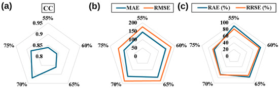 Hyperparametric analysis of the SMOreg model under different training–testing splits: (a) CC, (b) MAE and RMSE, (c) RAE and RRSE.