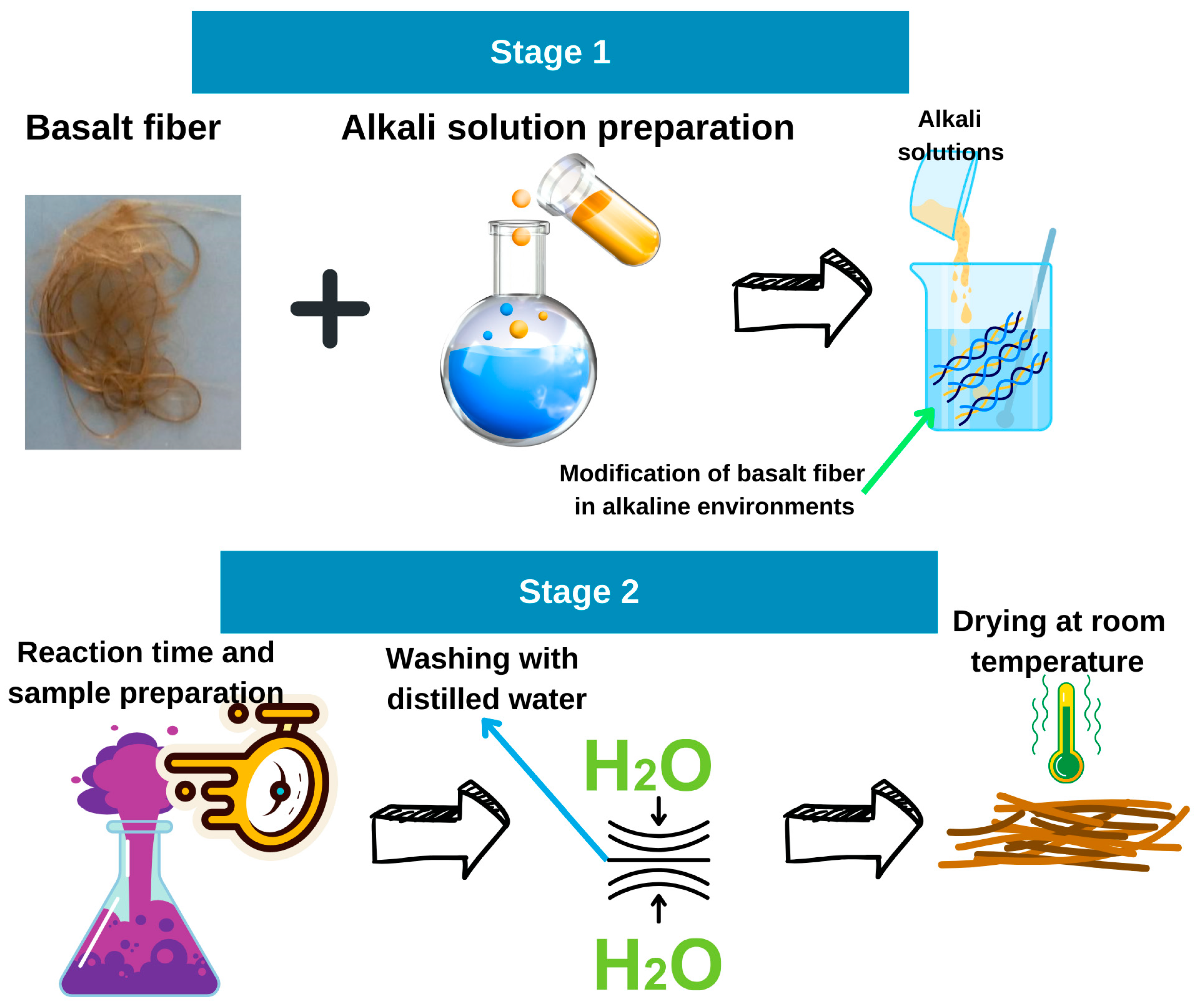 - Li, M.; Xing, D.; Zheng, Q.-B.; Li, H.; Hao, B.; Ma, P.-C. Variation on the morphology and tensile strength of basalt fiber processed in alkali solutions. Constr. Build. Mater. 2022, 335, 127512. [Google Scholar] [CrossRef]