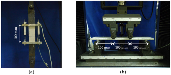 Setup configuration of mechanical tests: (a) tensile test; (b) bending test.