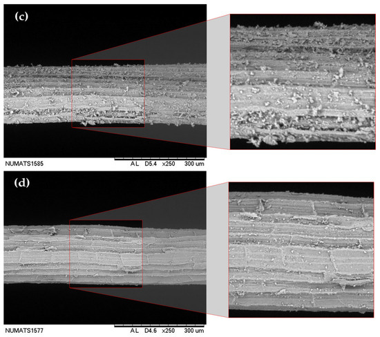 To evaluate the effect of the treatment on fiber morphology, five samples were selected for each treatment and coated with a 20 nm layer of gold. Images of the fiber lateral surfaces were obtained using a Hitachi TM3000 (Hitachi High-Tech, Tokyo, Japan) scanning electron microscope (SEM), operating in a low-vacuum environment at an acceleration voltage of 15 kV.
