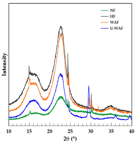 The modifications in the chemical composition and surface of the fibers resulting from the applied treatments directly affect their crystalline structure, as evidenced by the X-ray diffraction patterns shown in Figure 4. The graph presents the peaks that represent the crystalline planes of the cellulose (2θ = 17° and 23°) and an amorphous phase characterized mainly by lignin. For the fibers subjected to alkaline treatment U-WAF, an additional peak can be observed at 2θ = 29°, corresponding to calcium carbonate, similar to observed by [29]. Peaks not characteristic of the crystallographic planes of the lignocellulosic components and calcium carbonate can be attributed to the occurrence of fiber contamination or some inorganic impurity.