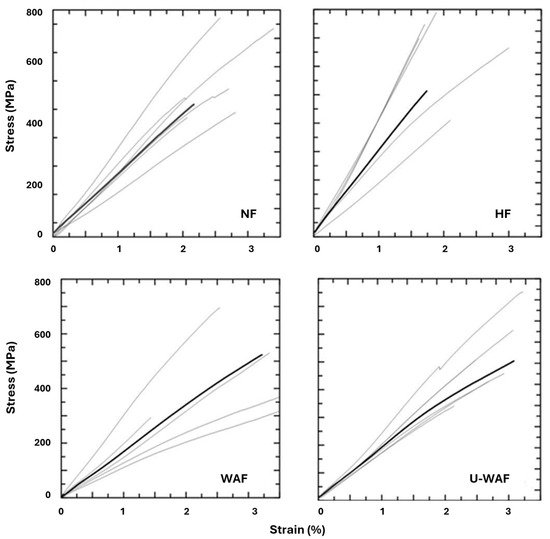 Tensile stress–strain of fibers (Black curves = average response; gray curves = individual tested samples).