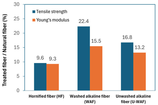 Hornification and alkaline treatments led to higher stress resistance and stiffness compared to untreated fibers [13,32]. This enhancement in mechanical performance can be attributed to changes in cellulose crystallinity and the formation of potential bonds between polymer chains within the internal fiber structures, including fibrils and microfibrils.
