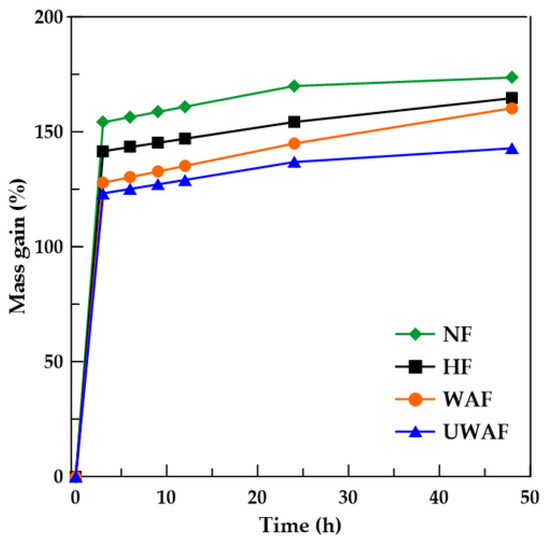 From the absorption curves, it is possible to state that in 3 h the NF absorbs 154.12%, the HF absorbs 141.54%, the WAF absorbs 127.81% and the U-WAF absorbs 123.19%. This time is sufficient for the fibers to practically reach about 90% of the total absorption capacity after 48 h of immersion, which was 173% for NF, 164% for HF, 160% and 142% for WAF and U-WAF, respectively. The treatments used reduce hydrophilic components (hydroxyl groups—OH), decreasing the water absorption capacity of the fiber. In the case of hornification treatment, the fiber cells become more densely packed, and the lumen is reduced after the process, which consequently decreases the fiber’s water absorption capacity [22]. It is observed that alkaline treatment is more effective than hornification in removing hydroxyl groups, as previously reported by [10].