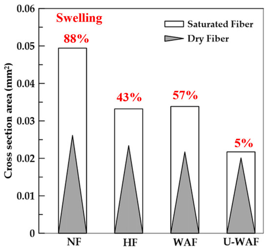 In Figure 8, the average values of the cross-sectional areas of the natural fibers and after the treatments are presented. For natural fiber (NF), the average area of dry fibers was 0.026 mm2 and the area of saturated fibers after 48 h was 0.049 mm2. For dry hornified fibers (HF), they presented an average section of 0.023 mm2 and saturated section of 0.033 mm2. In the fibers with alkaline treatment the average section of the dry fibers were 0.021 mm2 and 0.020 mm2 for the washed alkaline (WAF) and unwashed alkaline fiber (U-WAF), respectively, after saturation the fibers presented average section of 0.033 mm2 and 0.021 mm2.