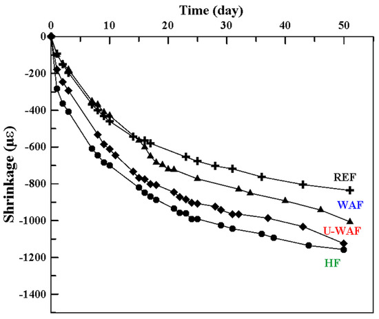 At 50 days, the drying shrinkage ranged from 861.87 µε for the reference matrix to 1062 µε, 1005.97 µε, and 1023.93 µε for the WAF, U-WAF, and UH composites, respectively. Notably, composites reinforced with alkaline-treated fibers showed lower drying shrinkage than those reinforced with hornified fibers, reflecting the reduced water absorption capacity of the fibers following alkaline treatment.
