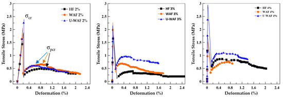 Figure 10 presents the typical stress–strain curves obtained from direct tensile tests of composites reinforced with 2%, 3%, and 4% treated fibers. The tests were terminated upon reaching the maximum deformation of the specimen and/or prior to the LVDT attaining its maximum displacement. Figure 11 illustrates the fracture modes of the composites under tensile loading, where in all cases the formation of a single crack was observed. Initially, the composites exhibit a linear elastic response up to the first-cracking point (σcr), followed by a sudden stress drop associated with the transfer of stresses from the brittle cementitious matrix to the fibers, which is characterized by a strain-softening behavior. With increasing deformation, a subsequent rise in stress is observed until the maximum post-cracking strength (σpcr) is reached. Beyond this point, the fibers bridging the cracks begin to be pulled out from the matrix, leading to a gradual reduction in stress. Similar behavior under tensile testing was observed by [35] for sisal fiber-reinforced mortar.