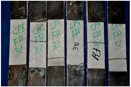 Figure 12 shows the stress–displacement curves under bending, with an initial linear elastic response up to the first-crack strength (σf), followed by a sudden stress drop. At this stage, the fibers are mobilized and begin to bridge the cracks, allowing the composite to sustain additional loads beyond matrix cracking until reaching a maximum stress value (σp), after which the gradual reduction in flexural strength begins. Similar flexural behavior was observed for cement mortar reinforced with sisal fiber treated with alkaline treatment and silane [11].