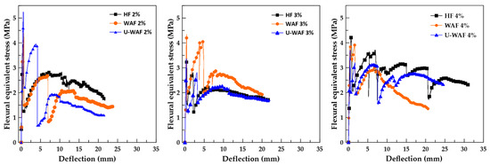 Unwashed alkaline fibers (U-WAF) produced the most significant improvements, achieving 2.16 MPa at 2% fiber content and a maximum of 2.56 MPa at 4%, representing an 88.2% increase relative to the matrix. At lower fiber contents (2% and 3%), deformation capacity remained limited (0.012–0.014%), whereas at 4% volume fraction, it increased to 0.022%, comparable to HF composites. This suggests that, at higher fiber volumes, the greater number of crack-bridging elements compensates for the stiffer individual fiber behavior, allowing for increased overall composite ductility.