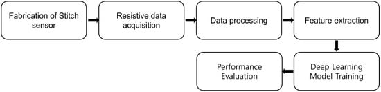 To address this gap, the present study investigates the electrical responses of five embroidered stitch geometries—straight, zigzag, joining, satin, and wave—under tensile deformation and proposes a structural convolutional neural network (S-CNN) to classify their signal characteristics. The proposed framework combines conventional methods such as PCA and Random Forest with a structural neural architecture designed to reflect the periodicity and geometry of stitched signals. Figure 1 outlines the overall research workflow.