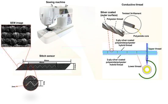 For stitching, we employed a silver-coated conductive yarn (AMANN Silver-Tech, Houston, TX, USA) comprising 34 filaments. Its core consists of a polyester and polyamide blend, and it has a specified linear resistance of approximately 530 Ω/m and a linear density of 28 tex. Sensor stitching was performed at the center of the textile using a Brother Innov-is 95 sewing machine (Cranleigh, UK), which can execute multiple stitch patterns. Each stitch pattern was applied with a consistent total length of 40 mm, though variations in width and geometry arose depending on the specific stitch pattern. The length of a single stitch was set to 2 mm. For linear stitches, the stitch width was approximately 1 mm, while curved stitches exhibited a width of around 1~5 mm. The fabrication process is illustrated in Figure 2.