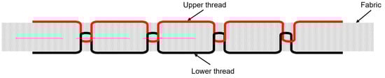 For sensor fabrication, a stretchable fabric named SP20D (POWERFIT, Seoul, Republic of Korea), composed of 92% polyester and 8% spandex, was used as the base textile. It is composed of 92% polyester and 8% spandex. The polyester is a blend of PET75/36 DTY (ASKIN, HYOSUNG Corporation, Seoul, Republic of Korea) and PET80/48 ITY at a 1F:1F ratio. This fabric has a basis weight of 153 g/m2. Unlike plain-woven fabrics, this textile is knit-based with inherent elasticity provided by spandex, making it particularly suitable for wearable applications. In this context, knit structural descriptors such as courses per inch (CPI), wales per inch (WPI), or loop density would be more appropriate than the conventional cover factor (K) used for woven fabrics. All fabric samples were cut along the wale direction to ensure consistency of specimen preparation. Consequently, when tensile deformation was applied perpendicularly to the wale direction, the stitches experienced strain predominantly along the course direction. Although anisotropy between wale and course directions in knit structures could potentially influence mechanical deformation and electrical response, this study controlled such effects by maintaining a fixed stitch orientation and test direction across all specimens. The woven morphology is presented in the SEM image shown in Figure 2. Each sensor was implemented through a single line of embroidered thread. The study incorporated five distinct stitch patterns: straight, zigzag, joining, satin, and wave. To circuit integration, we employed five stitching patterns: straight stitches as linear types and zigzag, joining, satin and wave stitches as curved types. All stitch patterns in this study exhibit an identical cross-sectional configuration, as they were fabricated using the same sewing machine settings and mechanism. The variation among stitch patterns is limited to the surface-level patterns determined by the machine’s programmed designs, with no impact on the depth or penetration profile of the stitches. Figure 3 presents the cross-sectional view of the stitches.