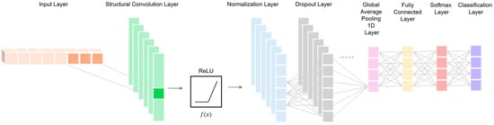 The S-CNN was designed with seven convolutional blocks, each including convolution, normalization, ReLU, and dropout layers. After these, a global average pooling layer reduces dimensionality, followed by a fully connected layer and a classification output using SoftMax activation []. The SoftMax function normalizes the outputs of K logits into a probability distribution where all values are between 0 and 1 and the total equals 1, as expressed in Equation (6) [].