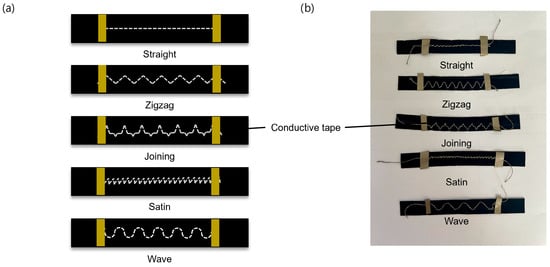 Five different stitch patterns were designed, and five samples were produced for each type []. All stitched sensors were produced at identical lengths. To ensure precise measurement of length, conductive tape (Gyeonggi-do, Republic of Korea) was attached to both ends of each stitch, enabling more accurate length control for all sensors. The tape was cut into strips with dimensions of 3 mm in width and 10 mm in length. The stitch patterns, arranged from top to bottom, include straight, zigzag, joining, satin, and wave patterns. Figure 6 presents both the schematic illustration and photographs of the stitched sensors.