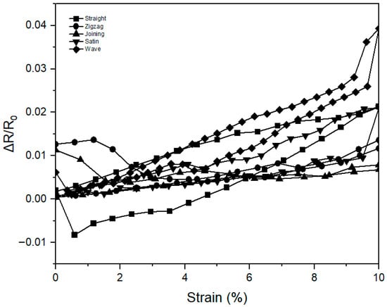 The experiments were conducted at room temperature (20–25 °C), and changes in electrical resistance were measured within a tensile strain range of 10%. The data represents the average resistance change ratio obtained by stretching and releasing five samples for each stitch pattern over five repeated cycles (Figure 8).